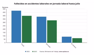 De acuerdo con los datos provisionales del Ministerio, los accidentes mortales en jornada de trabajo bajaron un 14% hasta julio, al registrarse 332 fallecidos, 54 menos que en igual periodo de 2022, mientras que los siniestros 'in itínere' con resultado de muerte disminuyeron un 24,7%, hasta un total de 67 fallecidos.