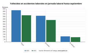 De acuerdo con los datos provisionales del Ministerio, los accidentes mortales en jornada de trabajo bajaron un 16,1% hasta septiembre, al registrar 431 fallecidos, 83 menos que en igual periodo de 2022, mientras que los fallecimientos 'in itinere' cayeron un 14,7%, hasta un total de 93.