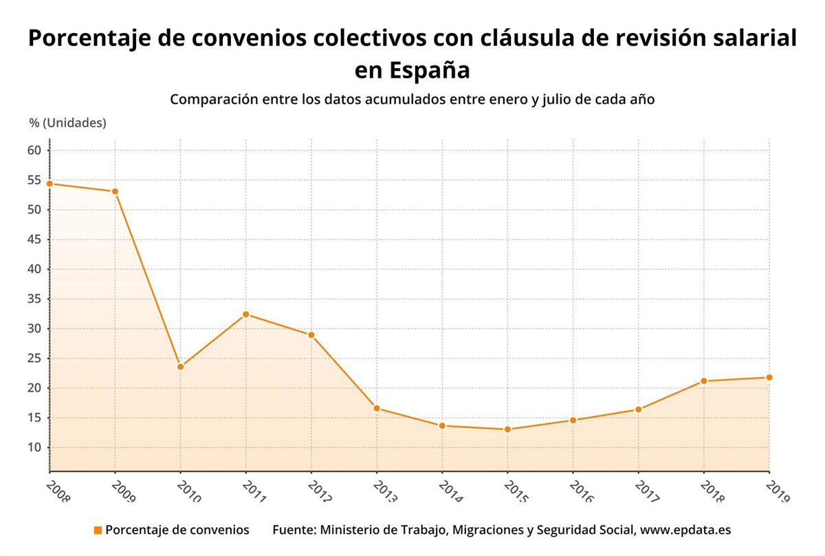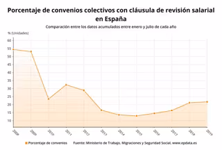 Hasta julio de 2019 el 21,8% de los convenios registrados por el Ministerio de Trabajo contemplaba cláusulas de revisión salarial, porcentaje que en 2018 era del 21,2% y que se halla más de ocho puntos por encima del mínimo que se alcanzó en 2015, cuando sólo el 13,06% de los convenios recogió este tipo de salvaguardas.