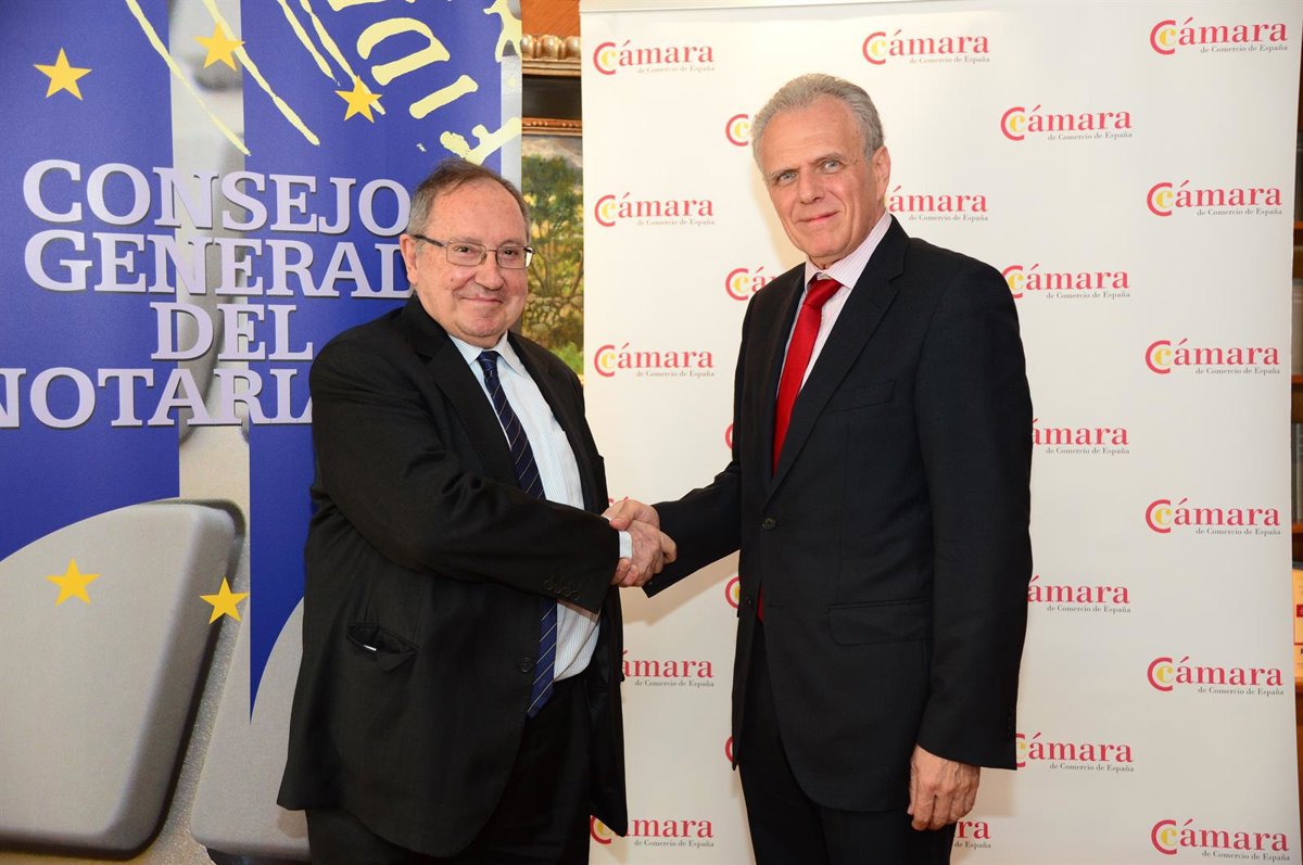 El presidente del Consejo General del Notariado, José Manuel García, y el de la Cámara de Comercio de España, José Luis Bonet, han firmado este martes un convenio de colaboración con el objetivo de simplificar trámites y aprovechar la información notarial disponible, especialmente para las transacciones comerciales entre empresas españolas y extranjeras.