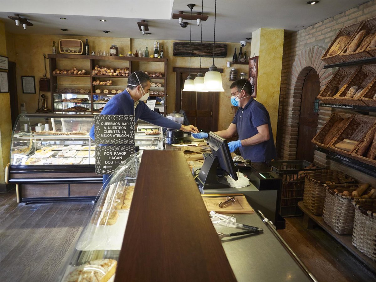 Un trabajador protegido con mascarilla ofrece producto a un cliente en el obrador panadería 'Panadero de Eugui' durante en el día 32 del estado de alarma, uno de los establecimientos que puede permanecer abierto por despachar alimentos en Huarte / Navar - Eduardo Sanz - Europa Press