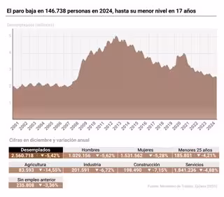 Infografía con cifras de paro en España a cierre de 2024. El paro registrado en las oficinas de los servicios públicos de empleo registró en 2024 un descenso de 146.738 personas (-5,4%), hasta un total de 2.560. - Europa Press