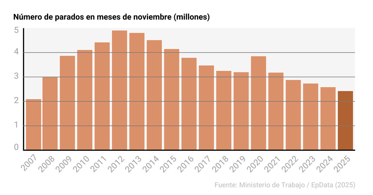 El descenso del desempleo registrado el mes pasado supera la caída experimentada en noviembre de 2024 (-16.036 parados), pero no las bajadas de 2023 (-24.573 desempleados), 2022 (-33.512) y 2021 (-74.381).