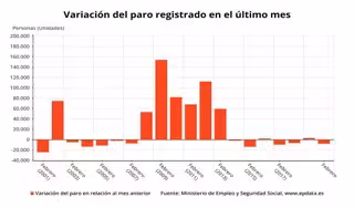 El descenso mensual del desempleo en febrero contrasta con el aumento en casi 3.300 personas experimentado en el mismo mes del año pasado y mejora levemente el retroceso que se registró en febrero de 2018 (-6.280 desempleados).