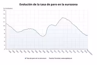 La tasa de paro de la zona euro se mantuvo estable en noviembre en el 7,5%, repitiendo así su nivel más bajo desde julio de 2008, mientras que en el conjunto de la UE volvió a situarse en el 6,3%, su mejor lectura desde que en el año 2000 comenzara a elaborar sus registros Eurostat, que mantiene a España como el segundo país de la UE con peores cifras de paro, con un 14,1%, solo por detrás del 16,8% de Grecia, que solamente dispone de datos hasta septiembre.
