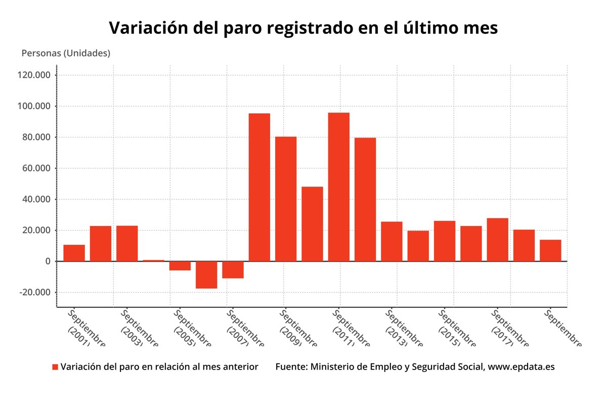 El paro y la afiliación en septiembre, en datos y gráficos MADRID, 2 Oct. (EUROPA PRESS) - El número de parados registrados en las oficinas de los servicios públicos de empleo (antiguo Inem) subió en 13.907 desempleados en septiembre (+0,4%), su menor alza en este mes desde 2004, cuando aumentó en 874 personas. Tras el repunte de septiembre, el segundo consecutivo después del de agosto, el volumen total de parados se situó en 3.079.711 desempleados, su nivel más bajo en un mes de septiembre desde 2008, según ha informado este miércoles el Ministerio de Trabajo, Migraciones y Seguridad Social. Dentro de la serie histórica de septiembre, que se inicia en 1996, el paro ha subido siempre en este mes salvo en los años 2005, 2006 y 2007. El repunte de este año es el menor de los últimos 15 años: hay que remontarse hasta septiembre de 2004 para encontrar un ascenso de menor calibre (874 desempleados). Si se tienen en cuenta las bajadas del periodo 2015-2017, el dato de septiembre de este año sería el mejor desde 2007. En términos desestacionalizados, el paro bajó en el noveno mes del año en 28.629 personas. El sector servicios, como ocurre habitualmente al finalizar la temporada estival, fue el que más elevó el número de parados en septiembre, con un aumento de 24.419 desempleados (+1,1%), seguido del colectivo sin empleo anterior (+9.148 parados, +3,5%). El resto de sectores experimentaron descensos: la agricultura perdió 9.601 desempleados (-6,7%); la construcción redujo el número de parados en 7.599 personas (-2,9%) y la industria registró 2.460 desempleados menos (-0,9%). En el último año, el paro se ha reducido en 122.798 personas, a un ritmo interanual del 3,8%. SUBE MÁS ENTRE LAS MUJERES Y BAJA EN OCHO COMUNIDADES El paro subió en septiembre en ambos sexos, aunque más entre las mujeres, con 10.725 desempleadas más (+0,59%), frente a un repunte del desempleo masculino de 3.182 mujeres (+0,2%). Así, al finalizar septiembre, el número de mujeres en paro se situó en 1.828.991 y el de varones, en 1.250.720. Por edades, el desempleo entre los jóvenes menores de 25 años aumentó un 10% en septiembre en relación al mes anterior, con 22.694 parados más, mientras que el paro de las personas con 25 años y más disminuyó en 8.787 desempleados (-0,3%). El paro bajó en septiembre en ocho comunidades autónomas y subió en nueve. Los mayores retrocesos se registraron en País Vasco (-2.444 desempleados), Castilla-La Mancha (-2.145) y La Rioja (-932 desempleados), mientras que los ascensos estuvieron encabezados por Andalucía (+4.866 parados) y Extremadura (+4.025 desempleados). Por provincias, el paro se redujo en 18 de ellas, lideradas por Sevilla (-3.586 desempleados), Valencia (-2.573 parados) y Barcelona (-2.240 parados), y subió en 34, principalmente en Cádiz (+5.646 parados) y Badajoz (+2.498 desempleados). Entre los extranjeros, el desempleo subió en 6.558 personas en septiembre en relación al mes anterior (+1,8%), hasta un total de 365.923 parados. En términos interanuales son 8.131 parados menos (-2,2%) que en septiembre de 2018. SUBE LA CONTRATACIÓN En cuanto a la contratación, en el noveno mes del año se realizaron 2.094.635 contratos, un 7,3% más que en septiembre de 2018, de los que 238.723 fueron contratos indefinidos, el 11,4% del total, con un aumento del 2,5% respecto al mismo mes del año pasado. Del total de contratos indefinidos realizados en septiembre, los contratos a tiempo completo sumaron 130.385, un 3,8% más que en igual mes de 2018, en tanto que los contratos indefinidos a tiempo parcial totalizaron 108.338, con un alza interanual del 1,08%. En septiembre se efectuaron más de 1,8 millones de contratos temporales, de los que el 26,2% eran de obra o servicio con jornada a tiempo completo y el 24,59%, eventuales por circunstancias de la producción, también a jornada completa. Los contratos temporales a tiempo parcial representaron el 32,2%.