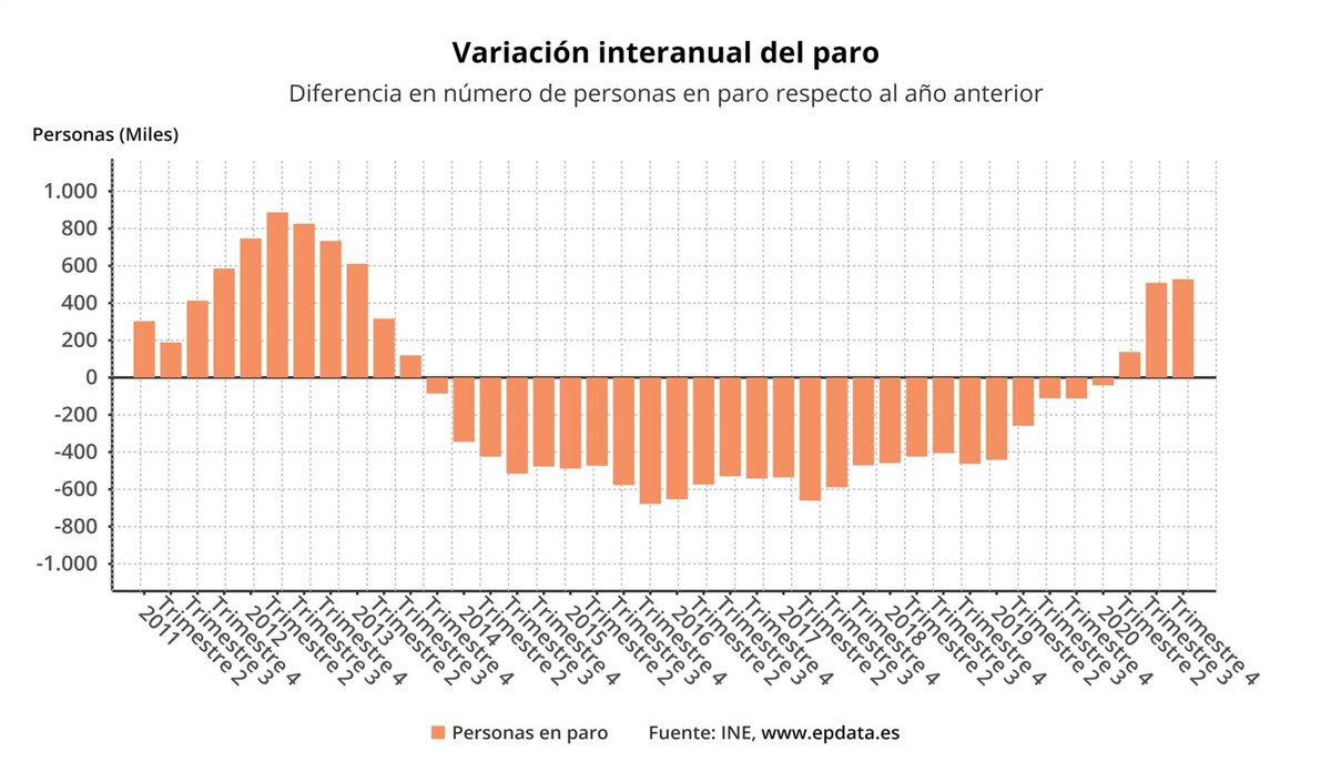 A estas cifras se llegó después de que en el cuarto trimestre de 2020 el paro bajara en 3.100 personas (-0,08%) y la ocupación aumentara en 167.400 personas (+0,87%), su segundo mayor crecimiento desde 2005 pese a la segunda y tercera ola de la pandemia.