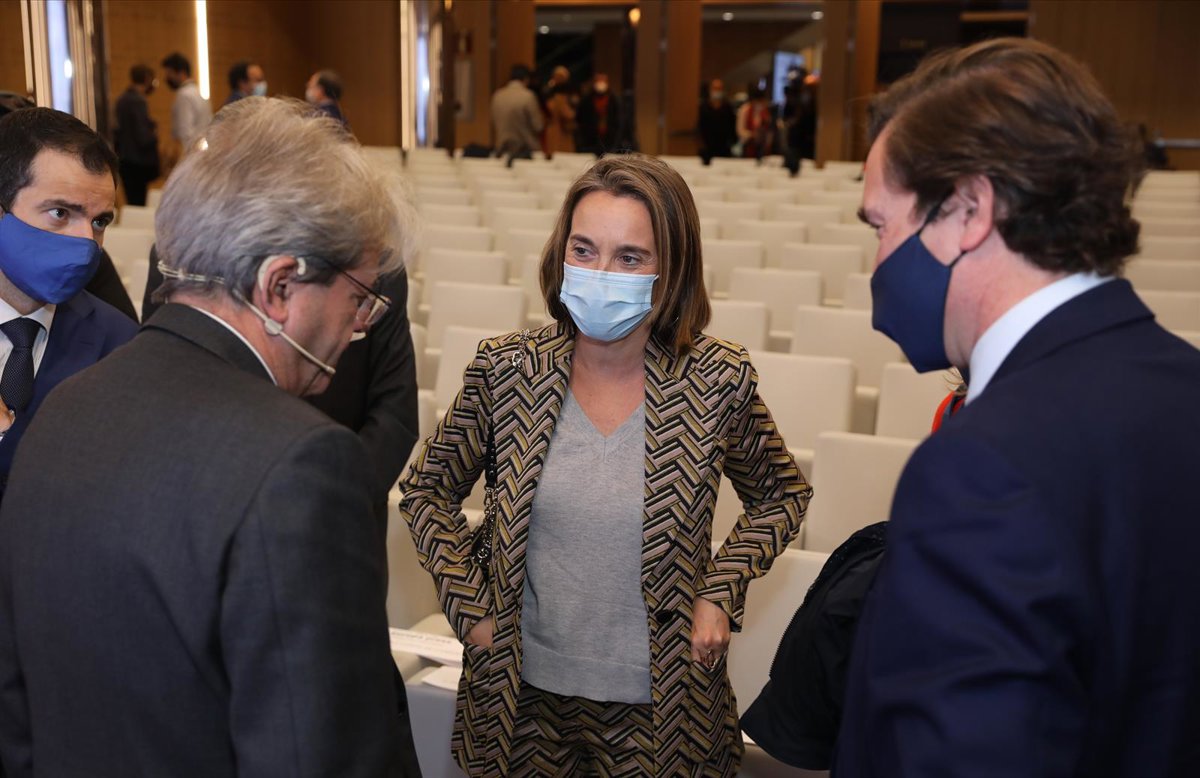 (I-D) El comisario europeo de Economía, Paolo Gentiloni; la portavoz parlamentaria, Cuca Gamarra; y el vicesecretario de Comunicación del PP, Pablo Montesinos, conversan a su llegada a un Desayuno Informativo de Europa Press - Isabel Infantes - Europa Press