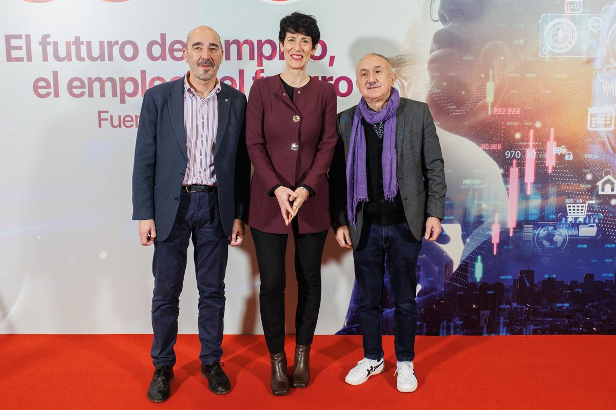 (I-D) El vicesecretario general de Política Sindical de UGT, Fernando Luján; la ministra de Inclusión, Seguridad Social y Migraciones, Elma Saiz, y el secretario general de UGT, Pepe Álvarez, posan antes de la inauguración de una jornadas sobre el futur - Alejandro Martínez Vélez - Europa Press