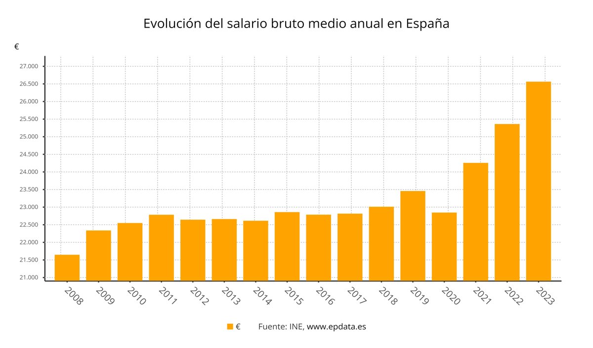 El salario bruto anual por trabajador alcanzó los 26.555,89 euros en 2023, lo que supone un aumento del 4,7% respecto al año anterior, y se situó en su nivel más elevado desde el inicio de la serie, en 2008, según los resultados de la Encuesta Anual de Coste Laboral (EACL), publicada este miércoles por el Instituto Nacional de Estadística (INE).