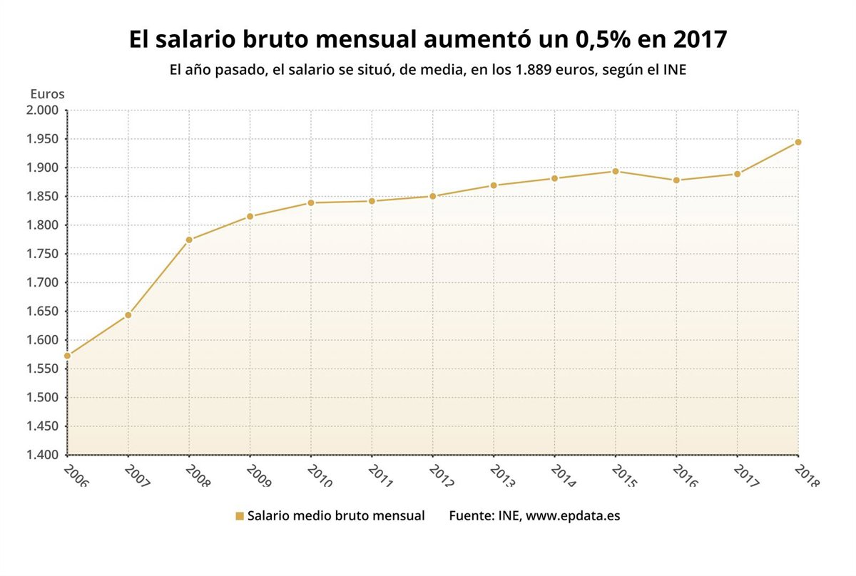 Evolución del salario bruto medio mensual en España hasta 2018 (INE) - EPDATA