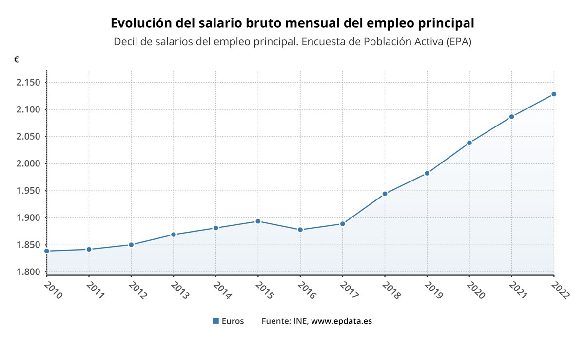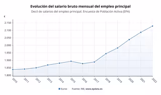 El salario medio mensual, en términos brutos, subió un 2% en 2022, hasta los 2.128,4 euros, su cifra más alta desde que comenzó la serie en 2006, según el decil de salarios que elabora el Instituto Nacional de Estadística (INE) a partir de los datos de la Encuesta de Población Activa (EPA).