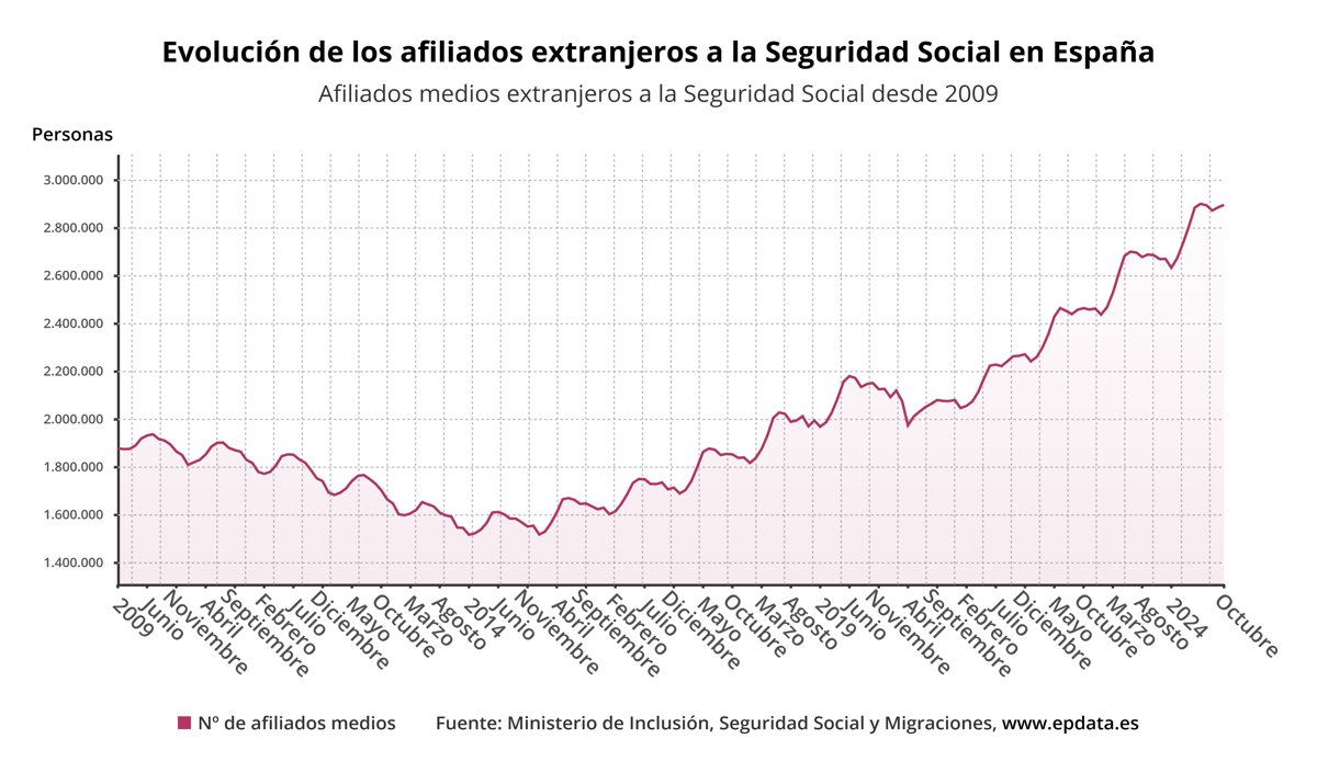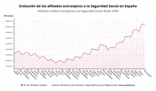 El Ministerio ha apuntado que el registro diario de afiliados extranjeros se mantuvo por encima de los 2,9 millones de cotizantes extranjeros durante ocho días en octubre y de forma consecutiva del 21 al 25 del mes.