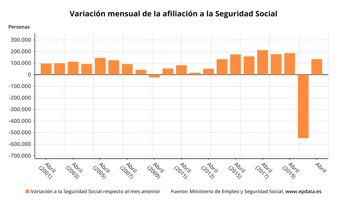 Este aumento contrasta con el fuerte descenso de afiliados registrado un año antes, cuando la primera ola del Covid provocó un retroceso de más de 548.000 ocupados. Excluyendo abril de 2020, la subida de cotizantes de abril de este año es la menor en este mes desde el ejercicio 2019 (+186.785 afiliados).