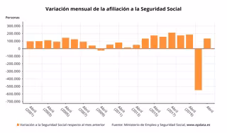 La Seguridad Social ganó en abril una media de 134.396 cotizantes respecto al mes de marzo (+0,7%), lo que situó el número total de ocupados en 19.055.298 cotizantes, según datos del Ministerio de Inclusión, Seguridad Social y Migraciones publicados este miércoles.