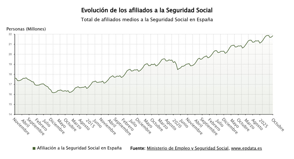En el último año, de octubre de 2024 a octubre de 2025, la Seguridad Social ha ganado 507.078 afiliados en valores medios, con un crecimiento interanual del 2,4%.