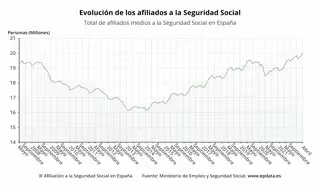 Evolución del número de afiliados a la Seguridad Social en España - EPDATA