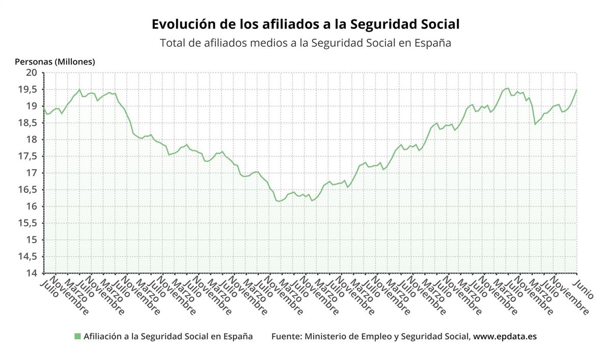 La Seguridad Social ganó en junio una media de 233.056 cotizantes respecto al mes de mayo (+1,2%), lo que situó el número total de ocupados en 19.500.277 cotizantes, según datos del Ministerio de Inclusión, Seguridad Social y Migraciones publicados este viernes.