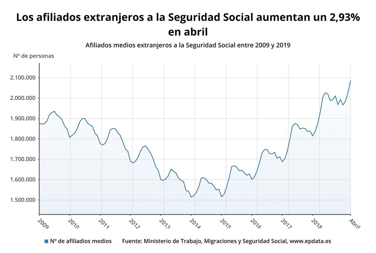 La Seguridad Social ganó una media de 59.443 cotizantes extranjeros en abril (+2,9%), hasta situarse el total de inmigrantes ocupados en 2.086.400 personas, informó este martes el Ministerio de Trabajo, Migraciones y Seguridad Social.