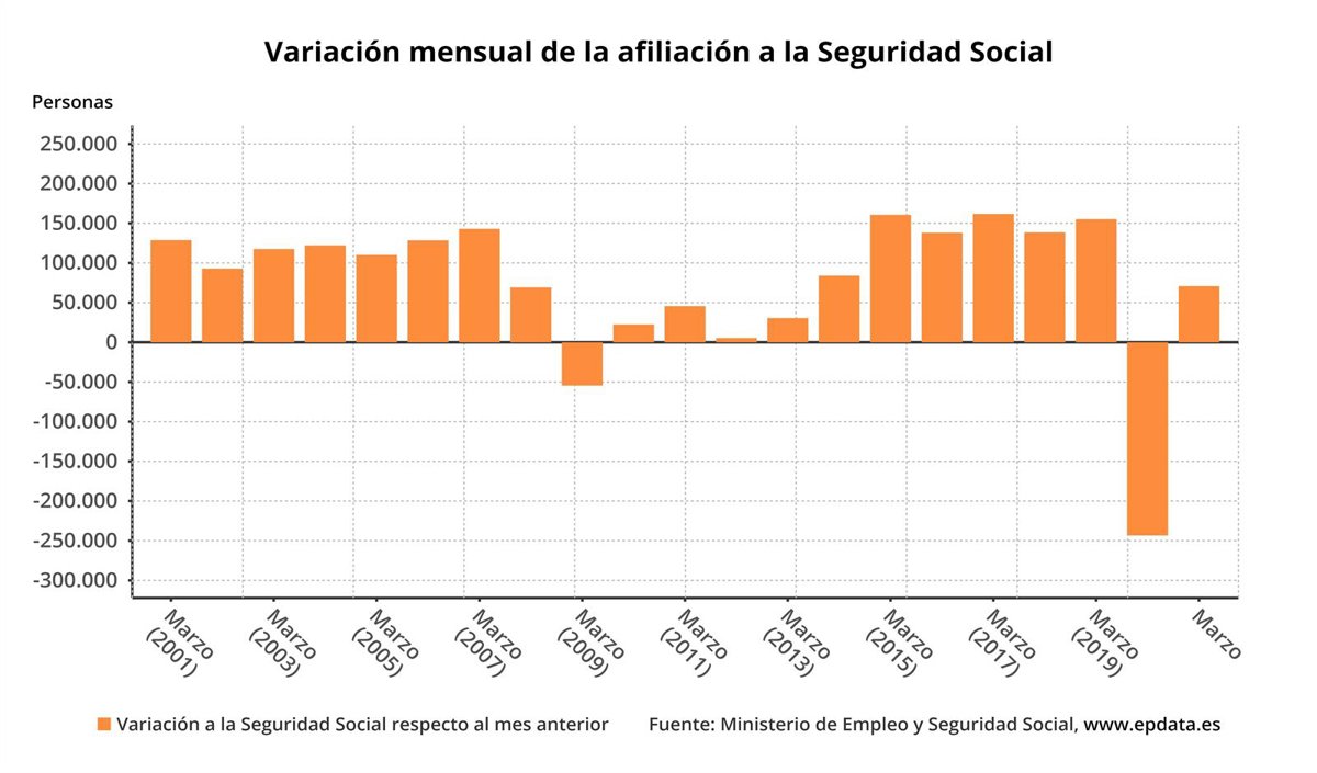 Variación mensual de la afiliación a la Seguridad Social en España hasta marzo de 2021 - EPDATA