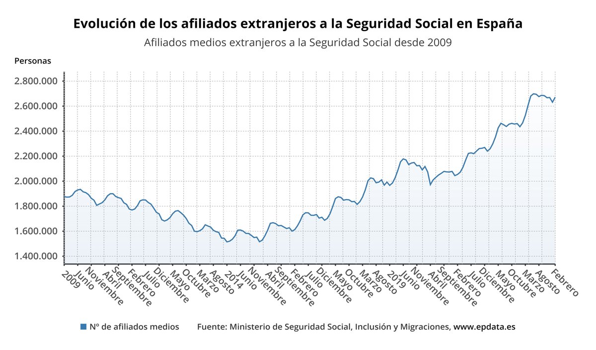 La Seguridad Social ganó una media de 39.953 afiliados extranjeros en febrero, un 1,5% más respecto al mes anterior, con lo que el segundo mes del año se cerró con 2.671.546 trabajadores inmigrantes inscritos en el sistema, lo que supone un nuevo máximo histórico.