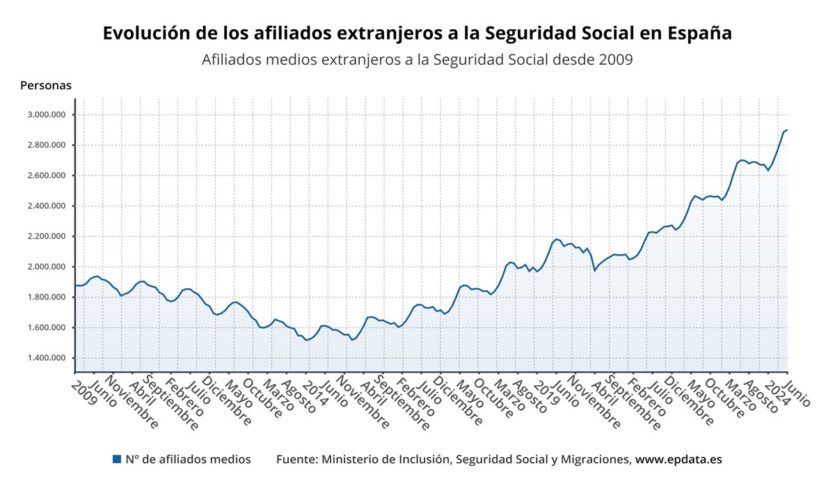 La Seguridad Social ganó una media de 16.036 afiliados extranjeros en junio, un 0,56% más respecto al mes anterior, con lo que el sexto mes del año se cerró con 2.899.003 afiliados procedentes de otros países, nuevo máximo histórico, según ha informado este martes el Ministerio de Inclusión, Seguridad Social y Migraciones.
