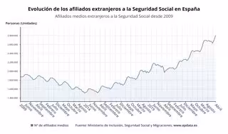 La Seguridad Social ganó una media de 77.912 afiliados extranjeros en mayo, un 2,8% más respecto al mes anterior, con lo que el quinto mes del año se cerró con 2.882.967 afiliados procedentes de otros países, nuevo máximo histórico, según ha informado este lunes el Ministerio de Inclusión, Seguridad Social y Migraciones.