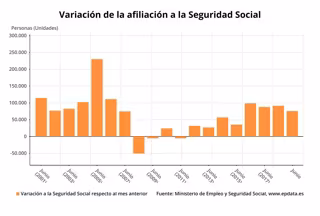 En valores interanuales, la afiliación ha crecido en 510.707 cotizantes desde junio de 2018 (+2,7%).