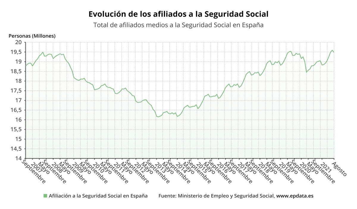 El Departamento que dirige José Luis Escrivá ha subrayado que entre los años 2009 y 2019 el promedio de pérdida de afiliados en agosto es de 147.000 personas, por encima del retroceso registrado en agosto de este año.