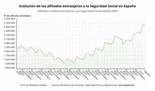 Evolución del número de afiliados extranjeros a la Seguridad Social - EPDATA