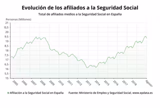 En términos interanuales, el Sistema sumó de media 480.413 afiliados, lo que supone un 2,55% más.