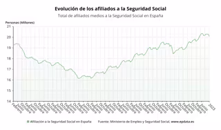 En el último año la Seguridad Social ha ganado 454.063 afiliados en valores medios, con un crecimiento interanual del 2,3%.