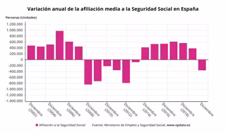 De este modo, el 'año de la pandemia' finalizó con 19.048.433 afiliados medios, lo que supone 26.432 cotizantes más que en noviembre (+0,1%), pero 360.000 menos que un año antes.