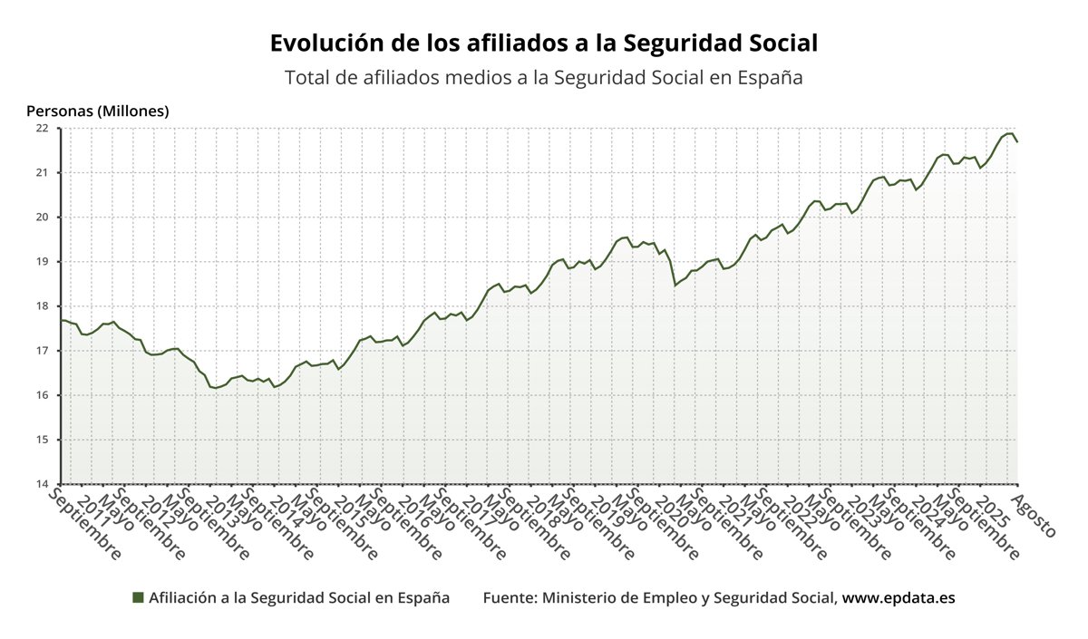 En el último año, de agosto de 2024 a agosto de 2025, la Seguridad Social ha ganado 476.801 afiliados en valores medios, con un crecimiento interanual del 2,2%.