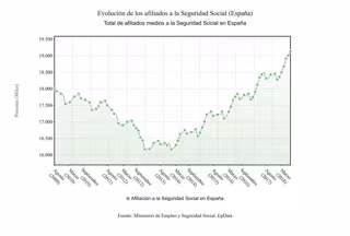 Según el Ministerio, hay que remontarse hasta agosto de 2008 para encontrar un dato superior al registrado este último mes (19.137.556 afiliados).