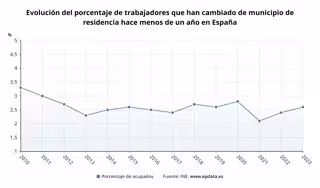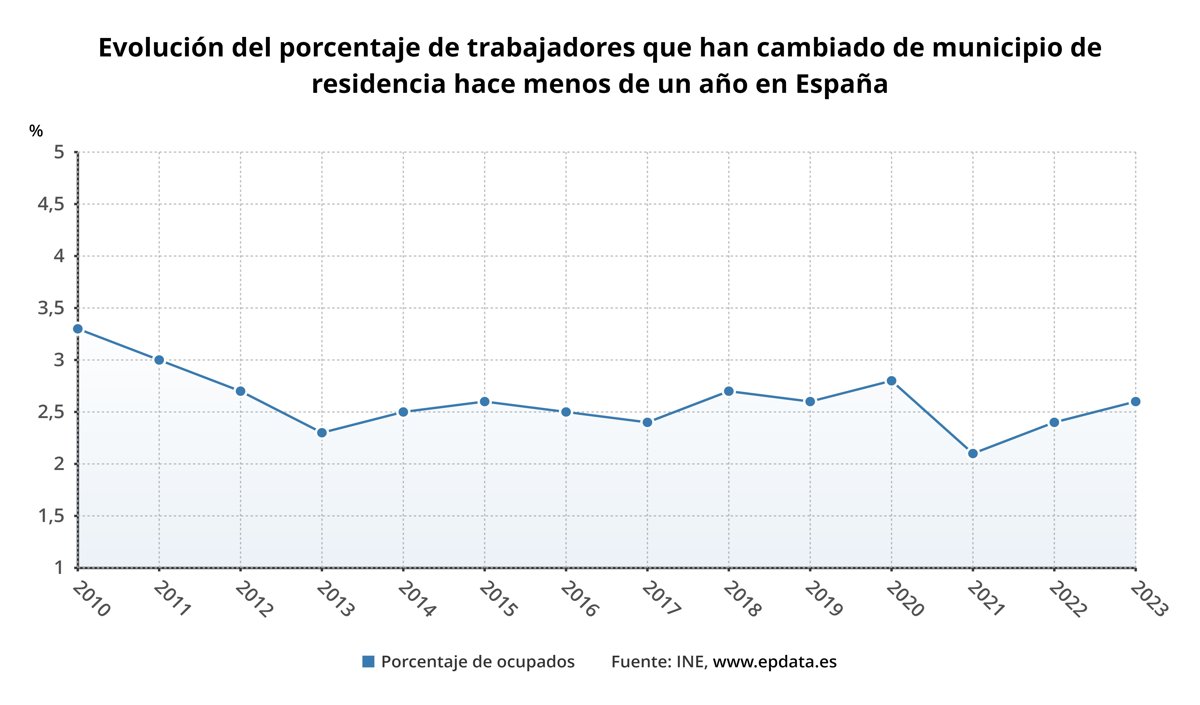 En términos absolutos, únicamente 531.100 de los 20.452.800 ocupados contabilizados en el primer trimestre de 2023 llevan residiendo en el municipio actual menos de un año.