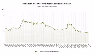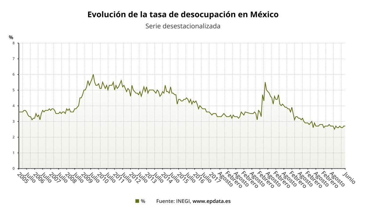 La tasa de desempleo de México se situó en el 2,7% en el segundo trimestre de 2025 hasta sumar 1,6 millones de personas, sin cambios respecto al mismo período del año anterior, según la Encuesta Nacional de Ocupación y Empleo (ENOE) difundida este martes por el Instituto Nacional de Estadística y Geografía (INEGI).