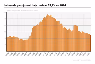 La tasa de paro juvenil se situó en el 24,90% a cierre de 2024, tasa 3,6 puntos inferior a la del ejercicio anterior (28,5%) y casi dos puntos por debajo de la del tercer trimestre de 2024, cuando el desempleo de los jóvenes menores de 25 años se situó en el 26,8%.