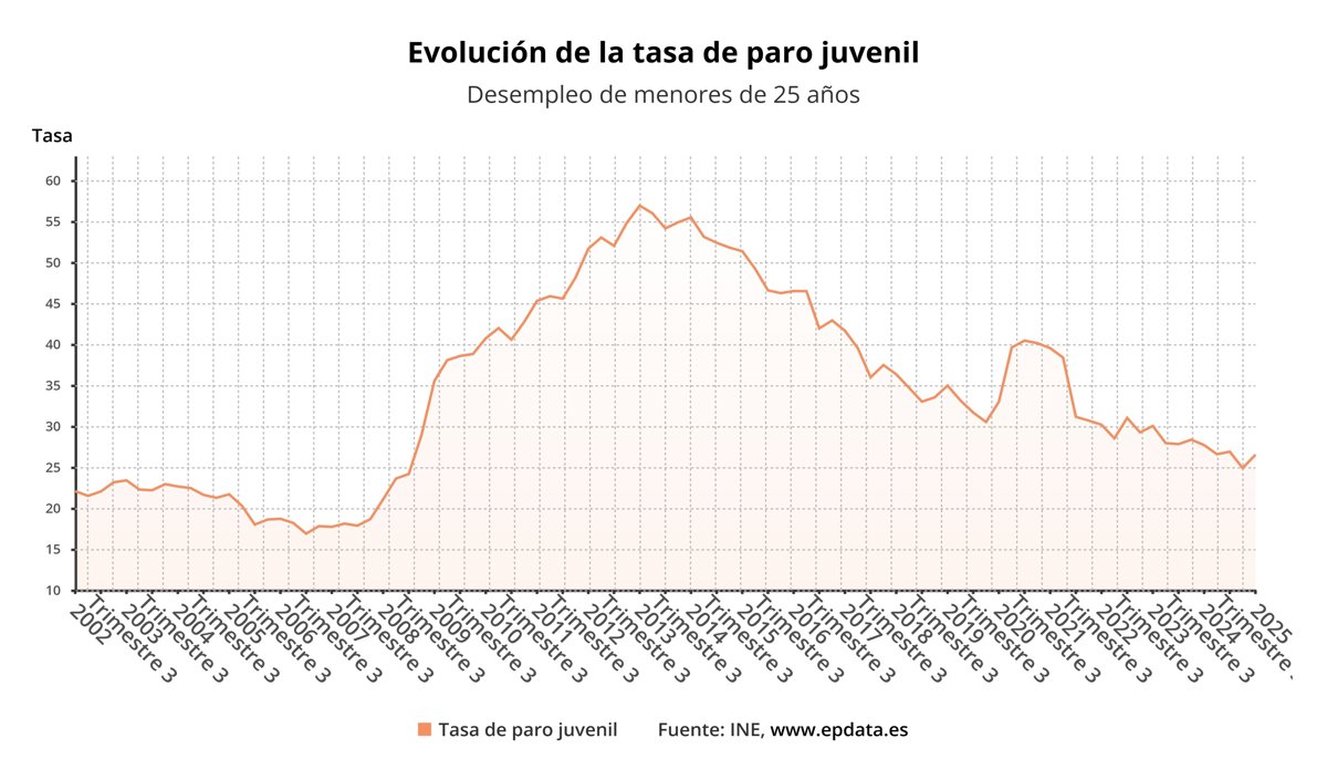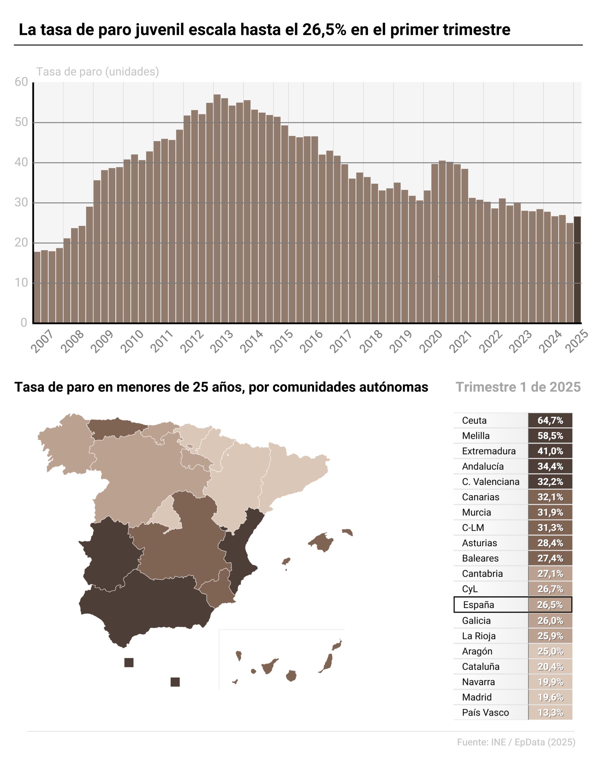 La tasa de paro juvenil se situó así en el 26,5% a cierre del primer trimestre, 1,6 puntos por encima de del último trimestre del año pasado (24,90%) y la más alta desde el tercer trimestre de 2024.