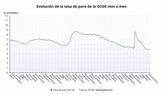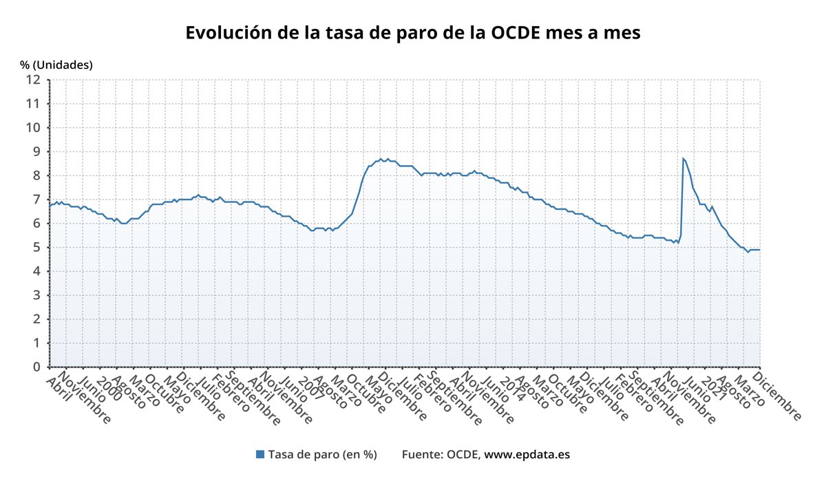 La tasa de paro de los países de la Organización para la Cooperación y el Desarrollo Económico (OCDE) se situó en diciembre de 2022 en el 4,9%, por lo que se mantuvo sin cambios por sexto mes consecutivo en esta cifra, que es la más baja desde que la serie histórica empezó en 2001, según ha informado este martes el organismo.