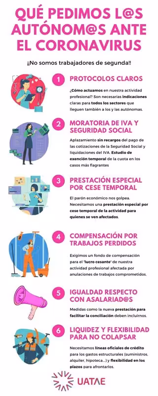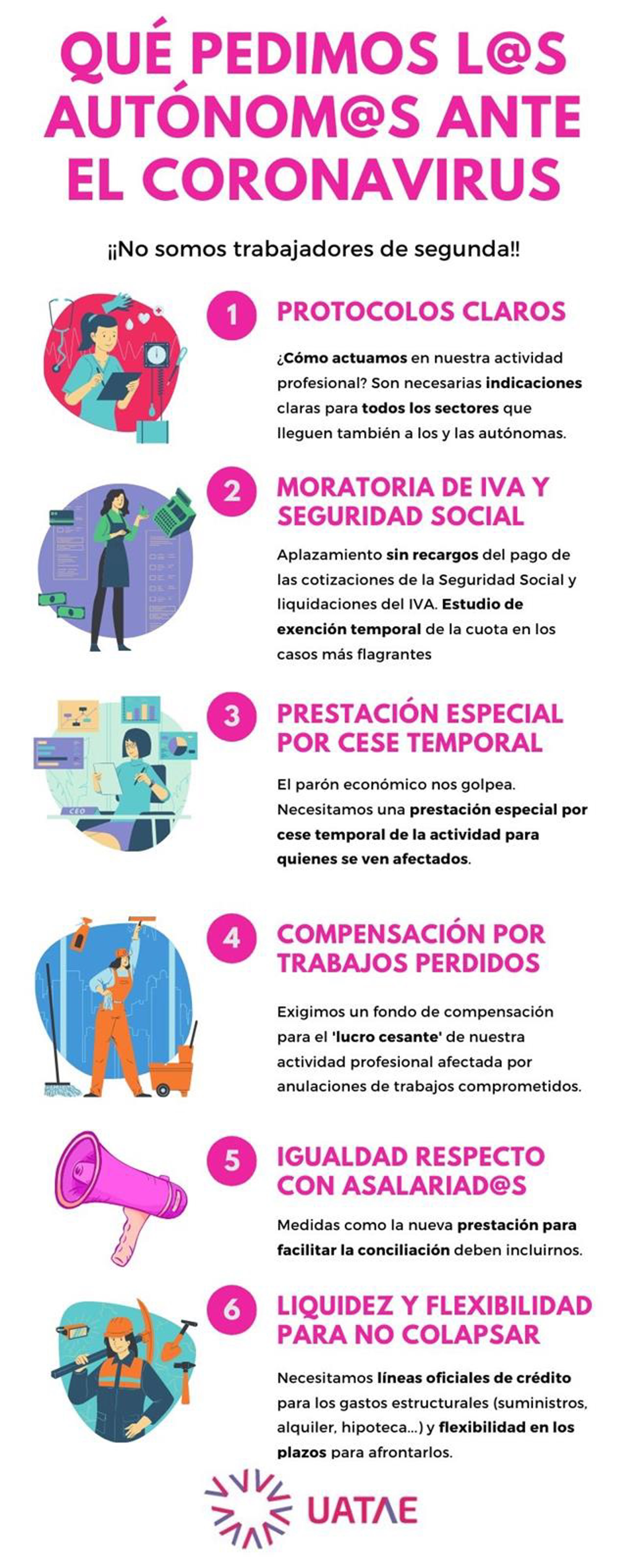 En un comunicado, Uatae ha señalado que las medidas "se quedan cortas" y cree que el Gobierno "no parece ser consciente de la magnitud del golpe económico que esta crisis está provocando a los más de 3,2 millones de trabajadores autónomos", según ha apuntado la secretaria general de Uatae, María José Landaburu.
