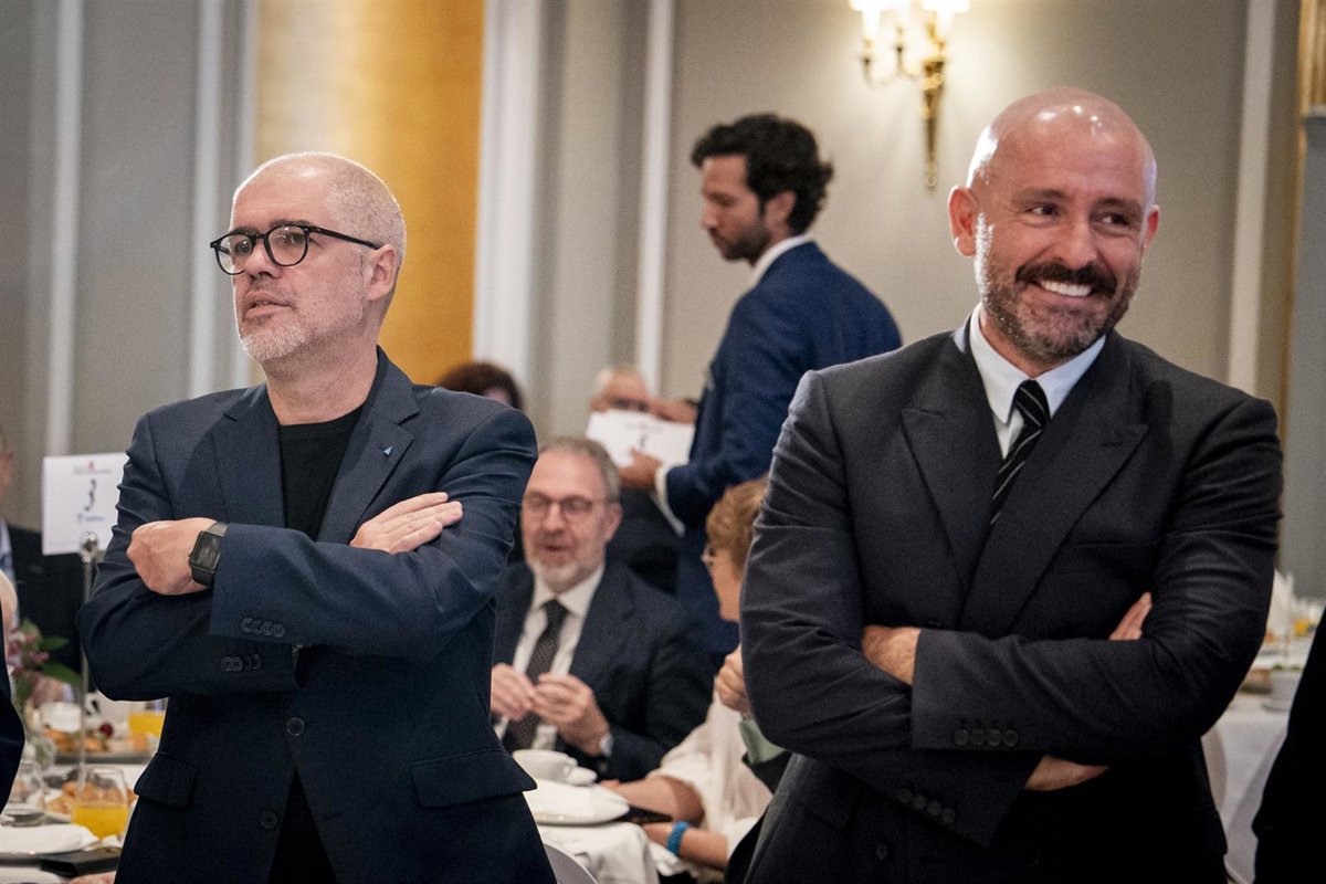 El secretario general de CCOO, Unai Sordo (I), durante el foro de la Nueva Comunicación, en el Hotel Mandarin Oriental Ritz, a 13 de octubre de 2025, en Madrid (España). - A. Pérez Meca - Europa Press