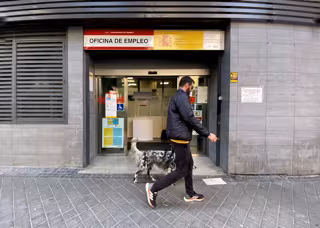 Un hombre pasa con su perro delante de una oficina de empleo en Madrid. - Eduardo Parra - Europa Press