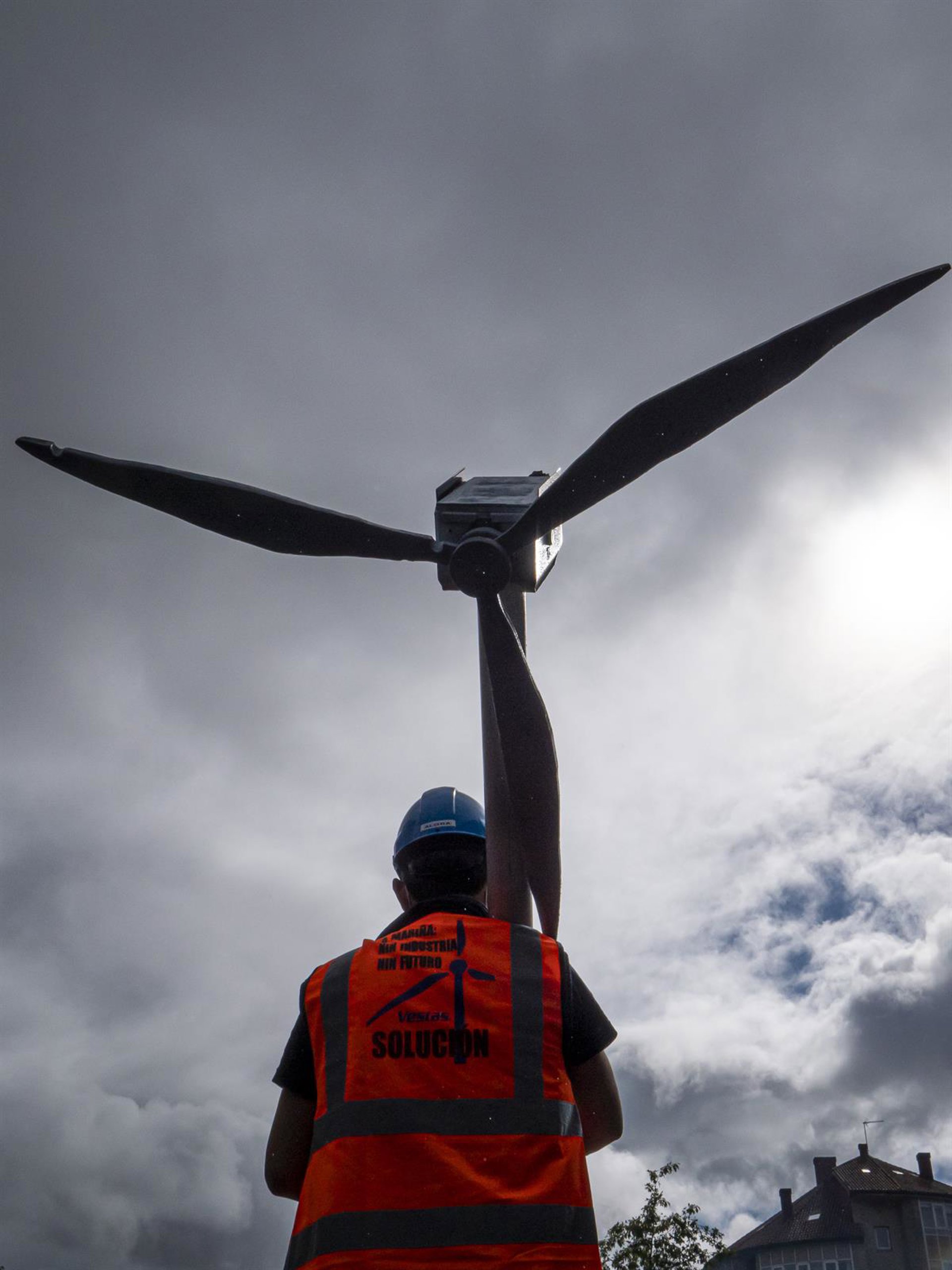 Archivo - Un trabajador de Vestas lleva un molino en una marcha contra el cierre de la fábrica de Viveiro (Lugo) que afectaría a 115 personas, a 5 de octubre de 2021, en Santiago de Compostela, Galicia, (España). Bajo el lema Vestas solución: polo futu