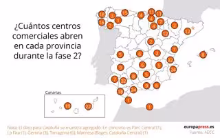 Entre las áreas con más comercios abiertos en los centros comerciales abiertos en la fase 2 figuran: Andalucía (5.668), Comunidad Valenciana (3.607), Canarias (3.078), Galicia (1.969), País Vasco (1.412), Murcia (1.330), Aragón (1.057).