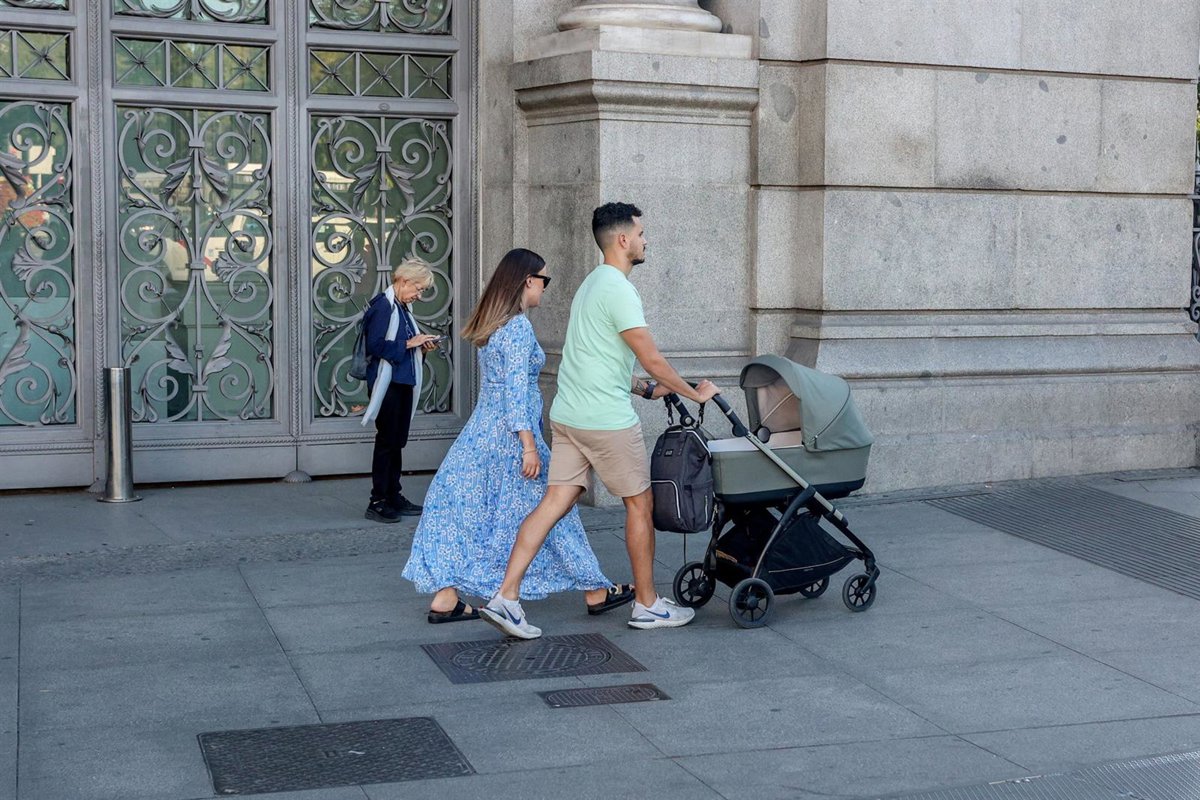 Archivo - Dos personas pasean por Madrid con un carrito de bebé. - Ricardo Rubio - Europa Press - Archivo