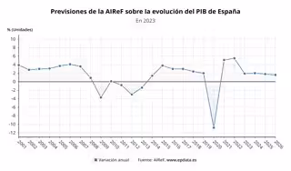 Aunque en línea con estas estimaciones, las proyecciones de la AIReF sobre la evolución de la economía son menos optimistas, ya que proyecta un avance del PIB próximo al 2% en 2023 y 2024, que se reduce al entorno del 1,7% en 2025 y 2026, cuando "desaparecerá" el impulso del Plan de Recuperación, Transformación y Resiliencia (PRTR).