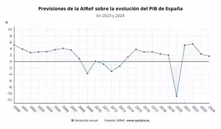 La Autoridad Independiente de Responsabilidad Fiscal (AIReF) ha revisado al alza en una décima el crecimiento del Producto Interior Bruto (PIB) real previsto para 2023, hasta el 2,4%, mientras que ha mantenido prácticamente inalterada la estimación de cara a 2024, en el 1,7%.