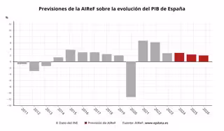 La Autoridad Independiente de Responsabilidad Fiscal (AIReF) ha actualizado sus previsiones macroeconómicas y espera que el Producto Interior Bruto (PIB) real aumente un 2,8% en 2024, un 2,3% en 2025 y un 2% en 2026, en un escenario sin medidas de ajuste presupuestario y fiscal ante las nuevas reglas fiscales europeas.