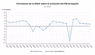 Aunque el dato es preliminar y se irá actualizando al incorporar nuevos indicadores al modelo, a día de hoy la AIReF apunta a una estimación intertrimestral para el PIB del 1% para el segundo trimestre de 2023, lo que se correspondería con una tasa interanual del 2,3%.